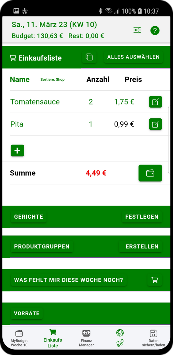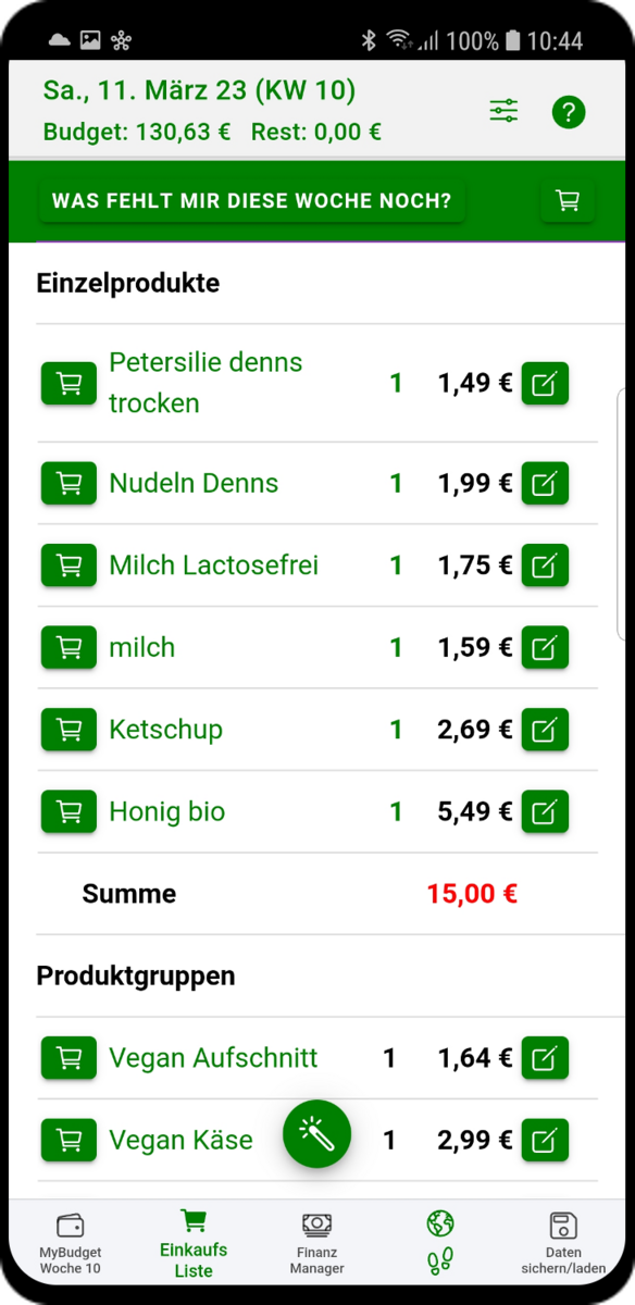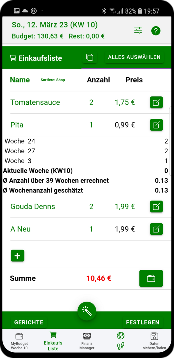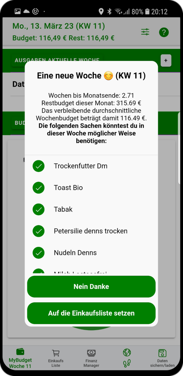 MyBudget kann aber noch mehr! Bei jedem neuen Wochenstart schlägt dir MyBudget auch eine Liste mit Dingen vor, die du gebrauchen könntest, je nachdem, was du als regelmäßig benötigt markiert hast.