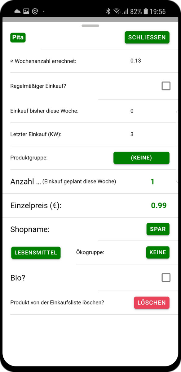 Mit einem Klick auf den Namen eines Produktes auf der Einkaufsliste siehst du immer die Wochennummer und Anzahl der vergangenen Einkäufe.